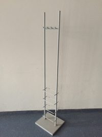 Pystynaulakko, jossa 8 koukkua. Narikka on metallia ja tukeva jalusta estää kaatumisen, vaikka naulakossa olisi painavia takkeja.